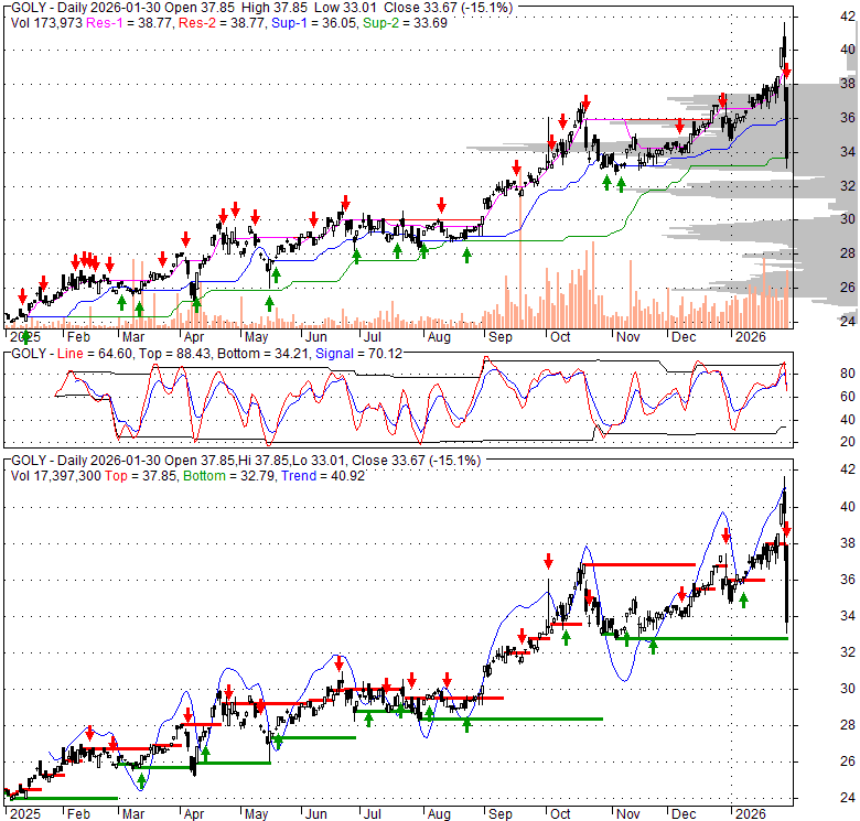 Price has closed below its short-term moving average. Short-term moving average is currently above mid-term; and above long-term moving average. From the relationship between price and moving averages: This stock is NEUTRAL in short-term; and BULLISH in mid-long term.[ GOLY ] has closed below the lower bollinger band by 15.0%. Although price has broken the lower band and a downside breakout is possible; the most likely direction for [ GOLY ] is to continue within current trading range. It is unclear right now based on current values. 97.9% wider than normal. The large width of the bands suggest high volatility as compared to its normal range. The bands have been in this wide range for 1 days. This is a sign that the current trend might continue.