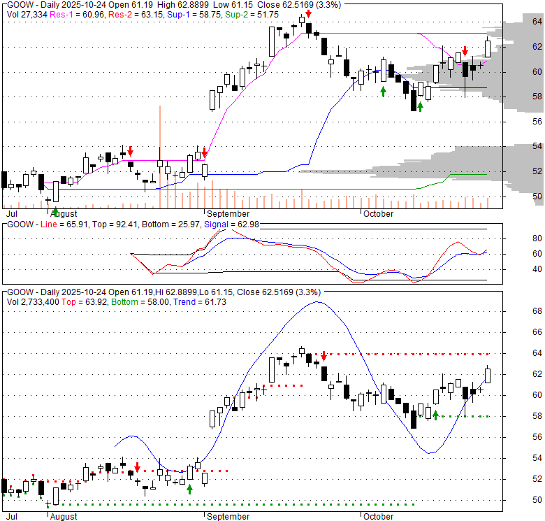 Price has closed above its short-term moving average. Short-term moving average is currently above mid-term; and below long-term moving average. From the relationship between price and moving averages: This stock is BULLISH in short-term; and NEUTRAL in mid-long term.[ GOOW ] has closed below upper band by 3.3%. Bollinger Bands are 0% narrower than normal.
