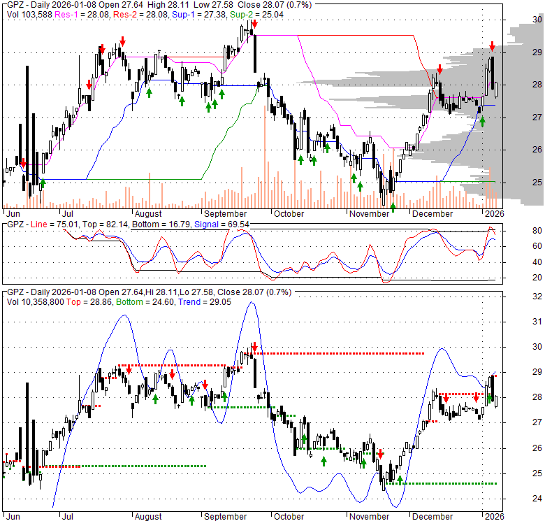 Price has closed below its short-term moving average. Short-term moving average is currently above mid-term; and above long-term moving average. From the relationship between price and moving averages: This stock is NEUTRAL in short-term; and NEUTRAL in mid-long term.[ GPZ ] has closed below upper band by 28.2%. Bollinger Bands are 13.8% narrower than normal. The current width of the bands does not suggest anything about the future direction or movement of prices.