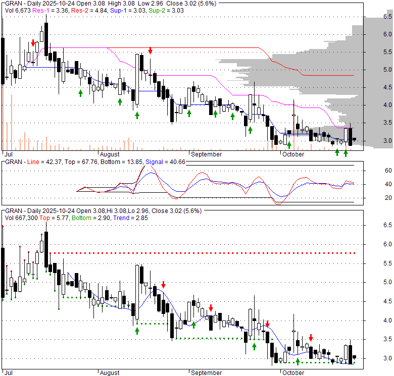 Price has closed below its short-term moving average. Short-term moving average is currently below mid-term; and below long-term moving average. From the relationship between price and moving averages: This stock is BEARISH in short-term; and NEUTRAL in mid-long term.[ GRAN ] has closed above bottom band by 34.7%. Bollinger Bands are 0% narrower than normal.