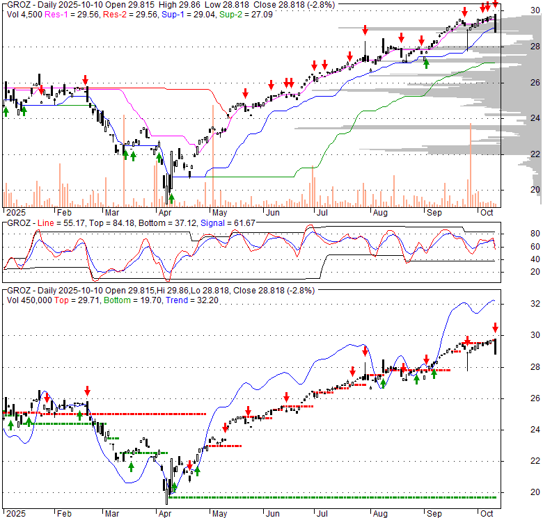 Price has closed below its short-term moving average. Short-term moving average is currently above mid-term; and above long-term moving average. From the relationship between price and moving averages: This stock is NEUTRAL in short-term; and BULLISH in mid-long term.[ GROZ ] has closed below the lower bollinger band by 0.2%. Although price has broken the lower band and a downside breakout is possible; the most likely direction for [ GROZ ] is to continue within current trading range. Bollinger Bands are 23.4% narrower than normal. The current width of the bands does not suggest anything about the future direction or movement of prices.