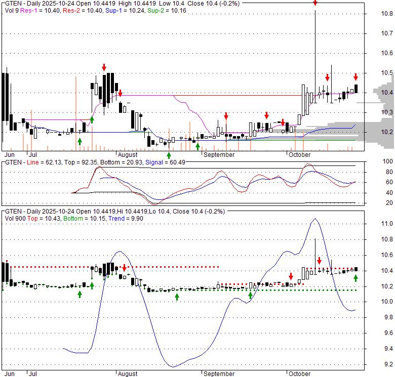Price has closed above its short-term moving average. Short-term moving average is currently above mid-term; and below long-term moving average. From the relationship between price and moving averages: This stock is BULLISH in short-term; and NEUTRAL in mid-long term.[ GTEN ] has closed below upper band by 38.1%. Bollinger Bands are 0% narrower than normal.