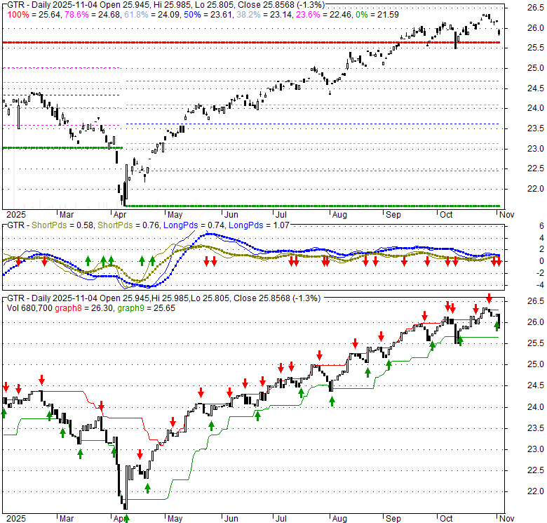 Price has closed below its short-term moving average. Short-term moving average is currently above mid-term; and above long-term moving average. From the relationship between price and moving averages: This stock is NEUTRAL in short-term; and BULLISH in mid-long term.[ GTR ] has closed above bottom band by 7.0%. Bollinger Bands are 0.7% narrower than normal. The current width of the bands does not suggest anything about the future direction or movement of prices.