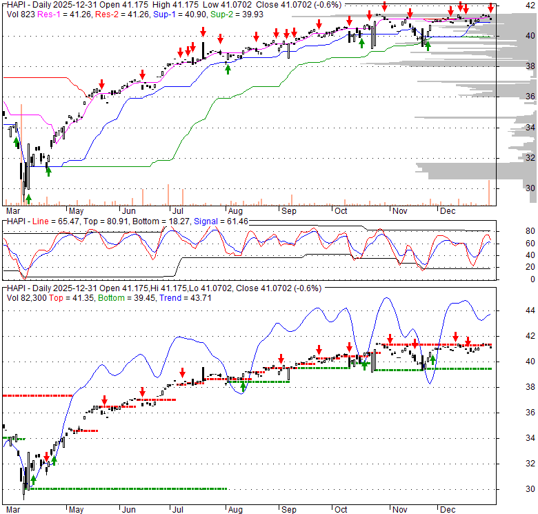 Price has closed below its short-term moving average. Short-term moving average is currently above mid-term; and above long-term moving average. From the relationship between price and moving averages: This stock is NEUTRAL in short-term; and BULLISH in mid-long term.[ HAPI ] has closed above bottom band by 44.9%. Bollinger Bands are 38.4% narrower than normal. The current width of the bands does not suggest anything about the future direction or movement of prices.