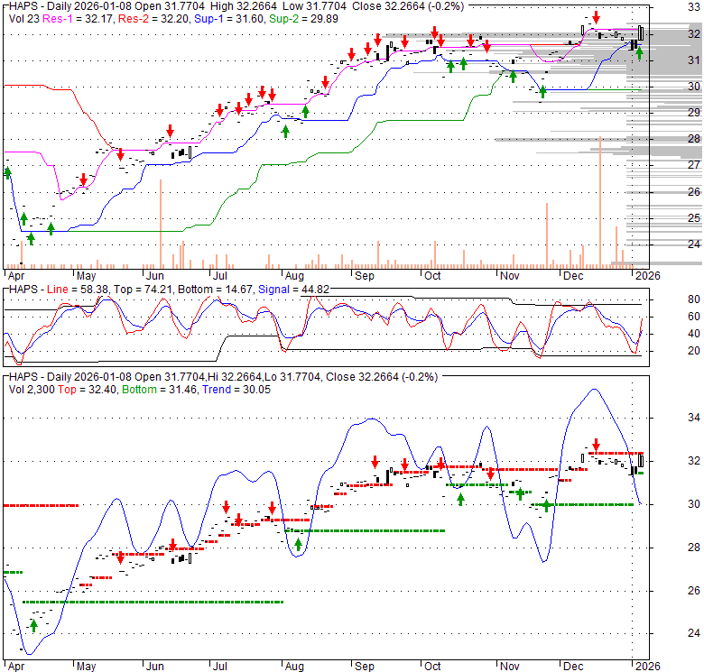 Price has closed above its short-term moving average. Short-term moving average is currently above mid-term; and above long-term moving average. From the relationship between price and moving averages: This stock is BULLISH in short-term; and BULLISH in mid-long term.[ HAPS ] has closed below upper band by 17.7%. Bollinger Bands are 30.9% narrower than normal. The current width of the bands does not suggest anything about the future direction or movement of prices.