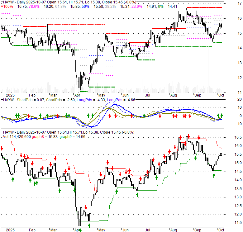 Price has closed above its short-term moving average. Short-term moving average is currently below mid-term; and above long-term moving average. From the relationship between price and moving averages: This stock is NEUTRAL in short-term; and NEUTRAL in mid-long term.[ HAYW ] has closed below upper band by 19.9%. Bollinger Bands are 9.3% narrower than normal. The current width of the bands does not suggest anything about the future direction or movement of prices.