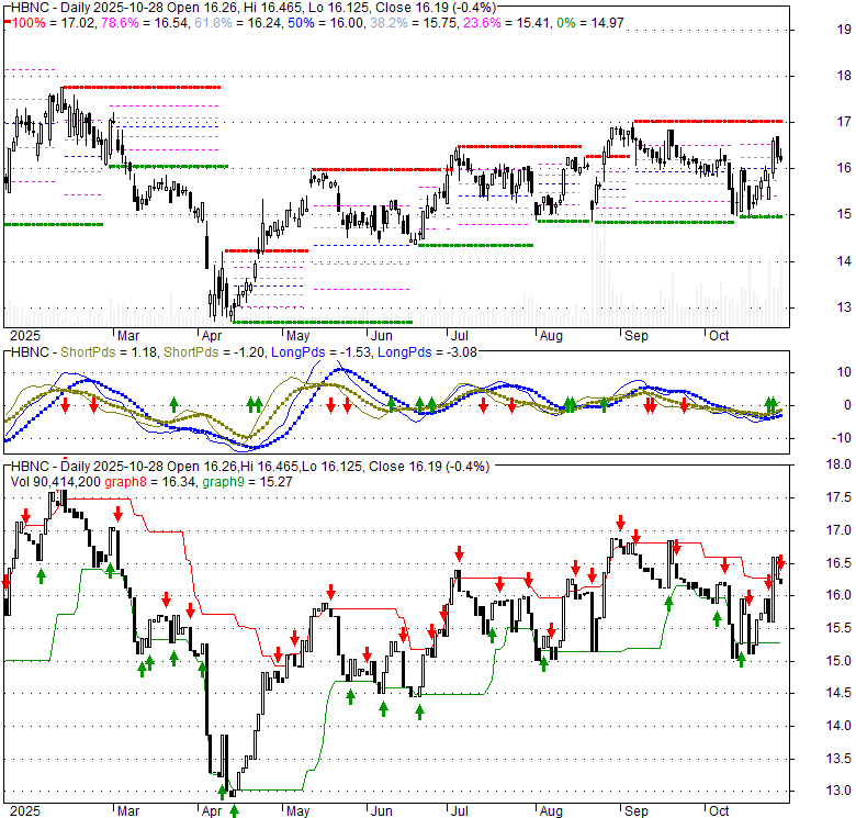Price has closed above its short-term moving average. Short-term moving average is currently below mid-term; and above long-term moving average. From the relationship between price and moving averages: This stock is NEUTRAL in short-term; and NEUTRAL in mid-long term.[ HBNC ] has closed below upper band by 19.8%. Bollinger Bands are 30% wider than normal. The current width of the bands does not suggest anything about the future direction or movement of prices.