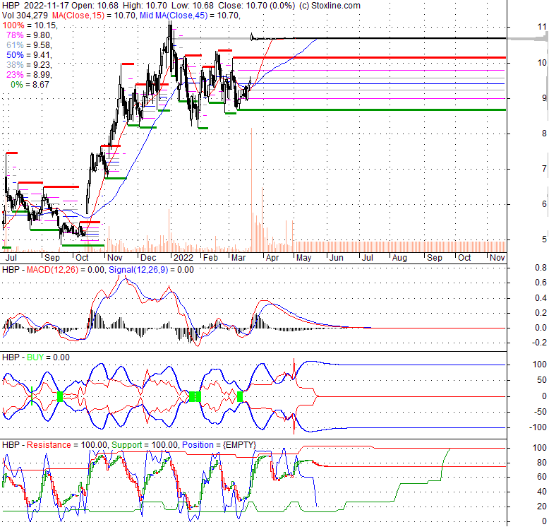 Price has closed below its short-term moving average. Short-term moving average is currently below mid-term; and below long-term moving average. From the relationship between price and moving averages: This stock is NEUTRAL in short-term; and NEUTRAL in mid-long term.[ HBP ] has closed Bollinger Bands are 0% narrower than normal.
