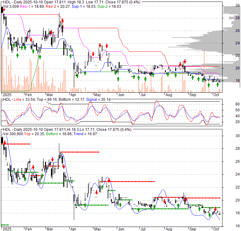 Price has closed below its short-term moving average. Short-term moving average is currently below mid-term; and below long-term moving average. From the relationship between price and moving averages: This stock is BEARISH in short-term; and BEARISH in mid-long term.[ HDL ] has closed above bottom band by 25.3%. Bollinger Bands are 38.2% narrower than normal. The current width of the bands does not suggest anything about the future direction or movement of prices.
