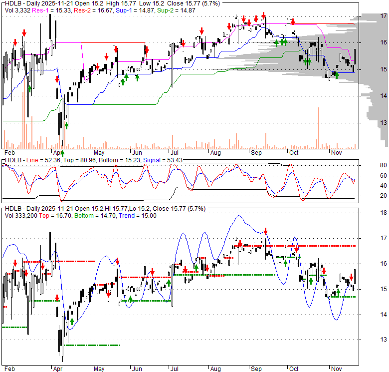 Price has closed above its short-term moving average. Short-term moving average is currently below mid-term; and below long-term moving average. From the relationship between price and moving averages: This stock is NEUTRAL in short-term; and BEARISH in mid-long term.[ HDLB ] has closed below upper band by 1.2%. Bollinger Bands are 2.4% narrower than normal. The current width of the bands does not suggest anything about the future direction or movement of prices.