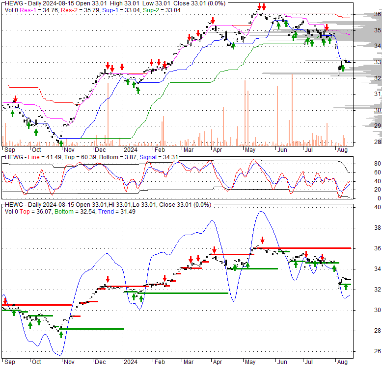 Price has closed below its short-term moving average. Short-term moving average is currently below mid-term; and below long-term moving average. From the relationship between price and moving averages: This stock is BEARISH in short-term; and BEARISH in mid-long term.[ HEWG ] has closed above bottom band by 33.5%. Bollinger Bands are 103.3% wider than normal. The large width of the bands suggest high volatility as compared to its normal range. The bands have been in this wide range for 8 days. This is a sign that the current trend might continue.