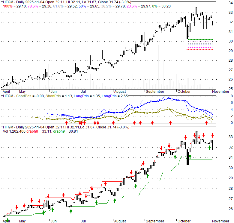Price has closed below its short-term moving average. Short-term moving average is currently above mid-term; and above long-term moving average. From the relationship between price and moving averages: This stock is NEUTRAL in short-term; and BULLISH in mid-long term.[ HFGM ] has closed below the lower bollinger band by 1.7%. If price is in a downtrend band; this downward trend might continue. However a short term pullback inside the band is likely. Bollinger Bands are 18.1% narrower than normal. The current width of the bands does not suggest anything about the future direction or movement of prices.
