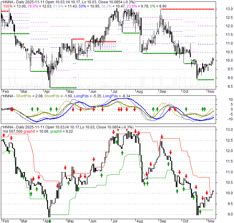 Price has closed above its short-term moving average. Short-term moving average is currently below mid-term; and below long-term moving average. From the relationship between price and moving averages: This stock is NEUTRAL in short-term; and BEARISH in mid-long term.[ HNNA ] has closed below upper band by 9.6%. Bollinger Bands are 40.5% narrower than normal. The narrow width of the bands suggests low volatility as compared to its normal range. The bands have been in this narrow range for 0 bars. This is a sign that the market may be about to initiate a new trend.