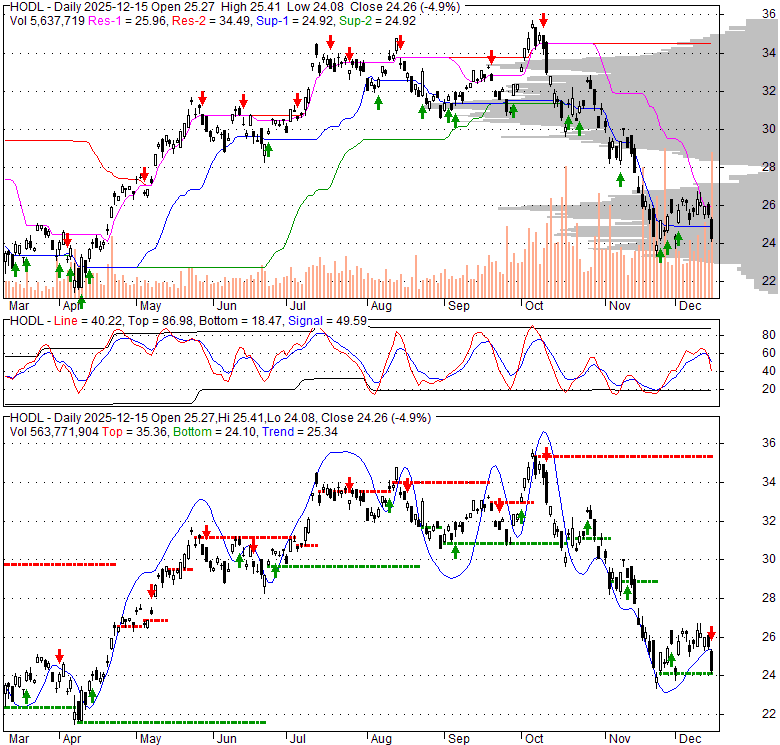 Price has closed below its short-term moving average. Short-term moving average is currently below mid-term; and below long-term moving average. From the relationship between price and moving averages: This stock is BEARISH in short-term; and BEARISH in mid-long term.[ HODL ] has closed above bottom band by 3.1%. Bollinger Bands are 35.1% narrower than normal. The current width of the bands does not suggest anything about the future direction or movement of prices.