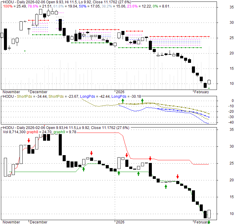 Price has closed below its short-term moving average. Short-term moving average is currently below mid-term; and below long-term moving average. From the relationship between price and moving averages: This stock is BEARISH in short-term; and NEUTRAL in mid-long term.[ HODU ] has closed above bottom band by 14.8%. Bollinger Bands are 0% narrower than normal.