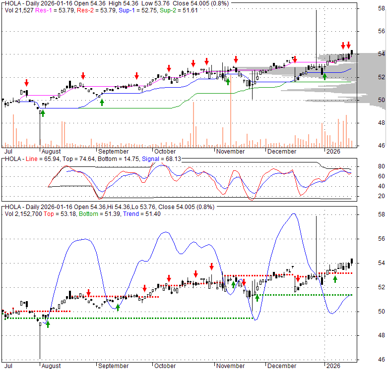 Price has closed above its short-term moving average. Short-term moving average is currently above mid-term; and above long-term moving average. From the relationship between price and moving averages: This stock is BULLISH in short-term; and BULLISH in mid-long term.[ HOLA ] has closed below upper band by 13.8%. Bollinger Bands are 28.1% wider than normal. The current width of the bands does not suggest anything about the future direction or movement of prices.