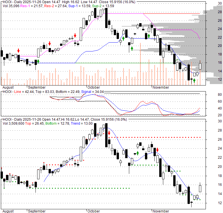 Price has closed above its short-term moving average. Short-term moving average is currently below mid-term; and below long-term moving average. From the relationship between price and moving averages: This stock is NEUTRAL in short-term; and NEUTRAL in mid-long term.[ HOOI ] has closed below upper band by 49.1%. Bollinger Bands are 0% narrower than normal.