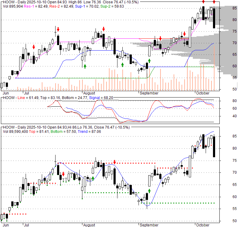 Price has closed below its short-term moving average. Short-term moving average is currently above mid-term; and below long-term moving average. From the relationship between price and moving averages: This stock is NEUTRAL in short-term; and NEUTRAL in mid-long term.[ HOOW ] has closed above bottom band by 44.0%. Bollinger Bands are 0% narrower than normal.