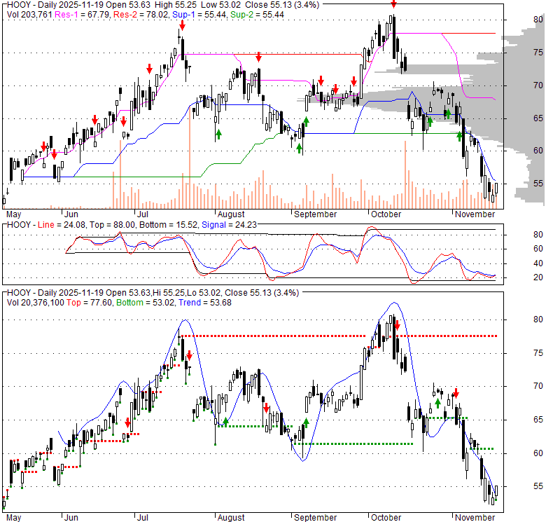 Price has closed above its short-term moving average. Short-term moving average is currently below mid-term; and below long-term moving average. From the relationship between price and moving averages: This stock is NEUTRAL in short-term; and BEARISH in mid-long term.[ HOOY ] has closed above bottom band by 21.3%. Bollinger Bands are 53.6% wider than normal. The large width of the bands suggest high volatility as compared to its normal range. The bands have been in this wide range for 3 days. This is a sign that the current trend might continue.