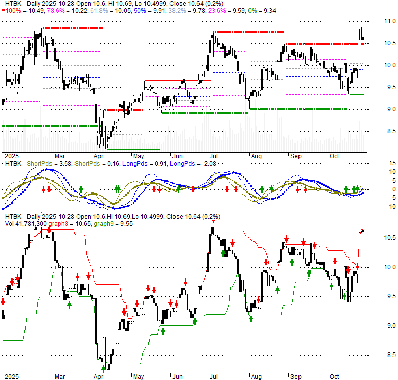 Price has closed above its short-term moving average. Short-term moving average is currently above mid-term; and above long-term moving average. From the relationship between price and moving averages: This stock is BULLISH in short-term; and BULLISH in mid-long term.[ HTBK ] has closed below upper band by 3.2%. Bollinger Bands are 63.3% wider than normal. The large width of the bands suggest high volatility as compared to its normal range. The bands have been in this wide range for 1 days. This is a sign that the current trend might continue.
