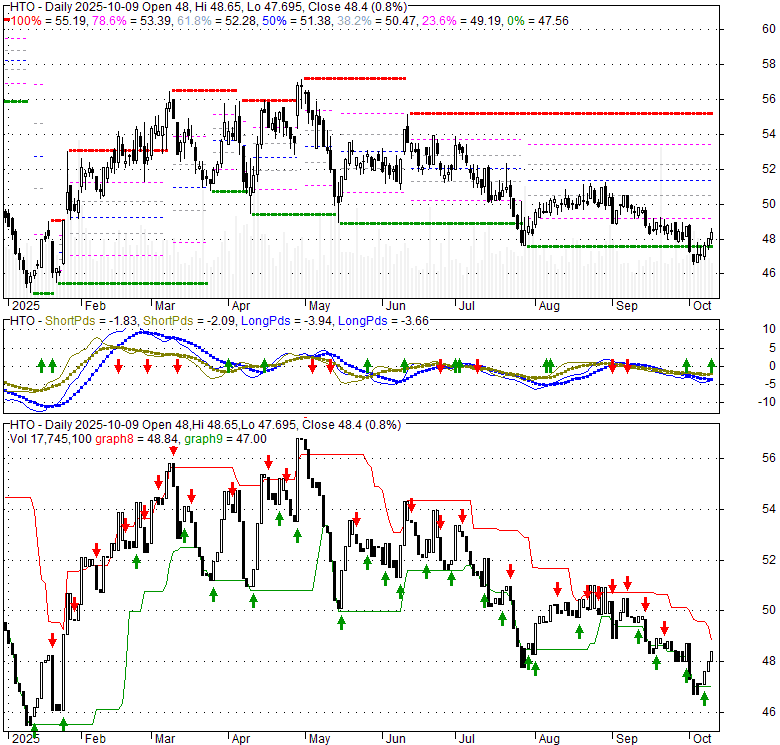 Price has closed above its short-term moving average. Short-term moving average is currently below mid-term; and below long-term moving average. From the relationship between price and moving averages: This stock is NEUTRAL in short-term; and BEARISH in mid-long term.[ HTO ] has closed below upper band by 37.6%. Bollinger Bands are 17.6% narrower than normal. The current width of the bands does not suggest anything about the future direction or movement of prices.