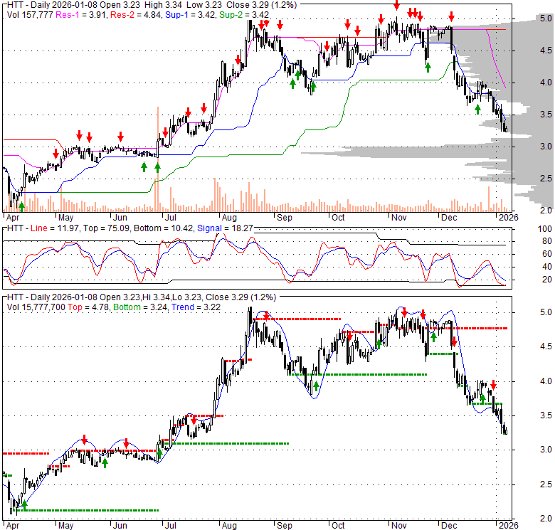 Price has closed below its short-term moving average. Short-term moving average is currently below mid-term; and below long-term moving average. From the relationship between price and moving averages: This stock is BEARISH in short-term; and BEARISH in mid-long term.[ HTT ] has closed above bottom band by 7.7%. Bollinger Bands are 9.4% wider than normal. The current width of the bands does not suggest anything about the future direction or movement of prices.
