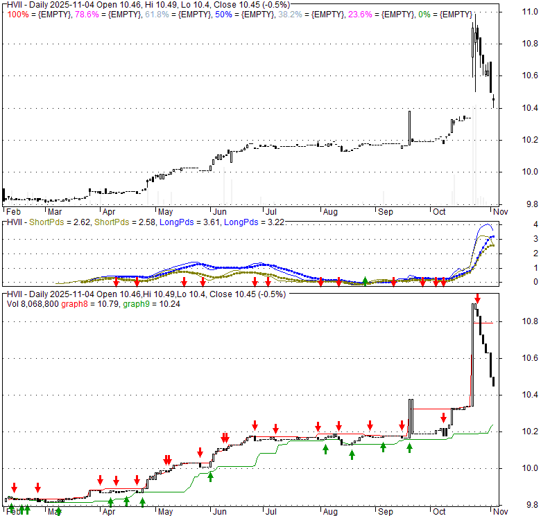 Price has closed below its short-term moving average. Short-term moving average is currently above mid-term; and above long-term moving average. From the relationship between price and moving averages: This stock is NEUTRAL in short-term; and BULLISH in mid-long term.[ HVII ] has closed above bottom band by 38.5%. Bollinger Bands are 401.5% wider than normal. The large width of the bands suggest high volatility as compared to its normal range. The bands have been in this wide range for 16 days. This is a sign that the current trend might continue.