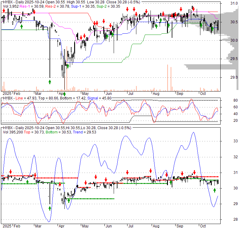 Price has closed below its short-term moving average. Short-term moving average is currently below mid-term; and below long-term moving average. From the relationship between price and moving averages: This stock is BEARISH in short-term; and NEUTRAL in mid-long term.[ HYBX ] has closed above bottom band by 17.0%. Bollinger Bands are 0.1% narrower than normal. The current width of the bands does not suggest anything about the future direction or movement of prices.
