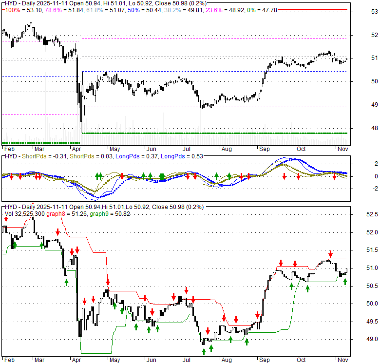 Price has closed above its short-term moving average. Short-term moving average is currently below mid-term; and above long-term moving average. From the relationship between price and moving averages: This stock is NEUTRAL in short-term; and NEUTRAL in mid-long term.[ HYD ] has closed above bottom band by 41.9%. Bollinger Bands are 28.1% narrower than normal. The current width of the bands does not suggest anything about the future direction or movement of prices.