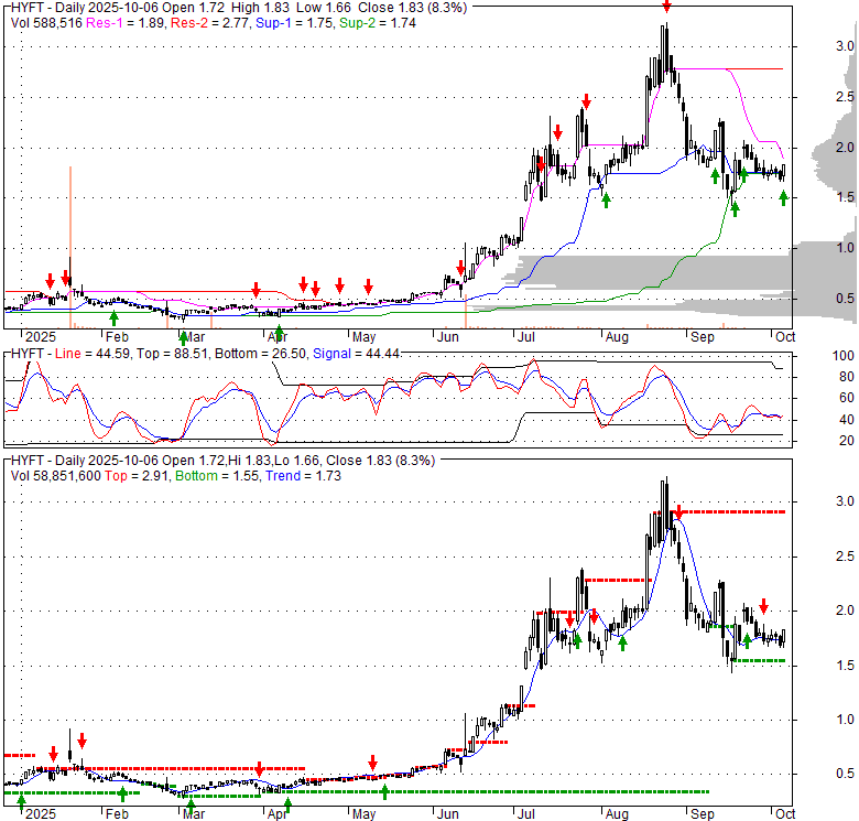 Price has closed above its short-term moving average. Short-term moving average is currently below mid-term; and above long-term moving average. From the relationship between price and moving averages: This stock is NEUTRAL in short-term; and NEUTRAL in mid-long term.[ HYFT ] has closed below upper band by 38.8%. Bollinger Bands are 43.7% narrower than normal. The narrow width of the bands suggests low volatility as compared to its normal range. The bands have been in this narrow range for 1 bars. This is a sign that the market may be about to initiate a new trend.