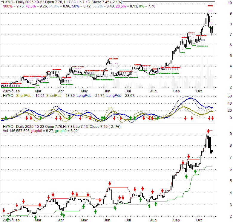 Price has closed below its short-term moving average. Short-term moving average is currently above mid-term; and above long-term moving average. From the relationship between price and moving averages: This stock is NEUTRAL in short-term; and BULLISH in mid-long term.[ HYMC ] has closed above bottom band by 45.0%. Bollinger Bands are 92.5% wider than normal. The large width of the bands suggest high volatility as compared to its normal range. The bands have been in this wide range for 8 days. This is a sign that the current trend might continue.
