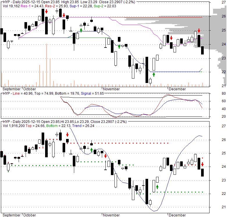 Price has closed below its short-term moving average. Short-term moving average is currently above mid-term; and below long-term moving average. From the relationship between price and moving averages: This stock is NEUTRAL in short-term; and NEUTRAL in mid-long term.[ HYP ] has closed above bottom band by 15.7%. Bollinger Bands are 0% narrower than normal.