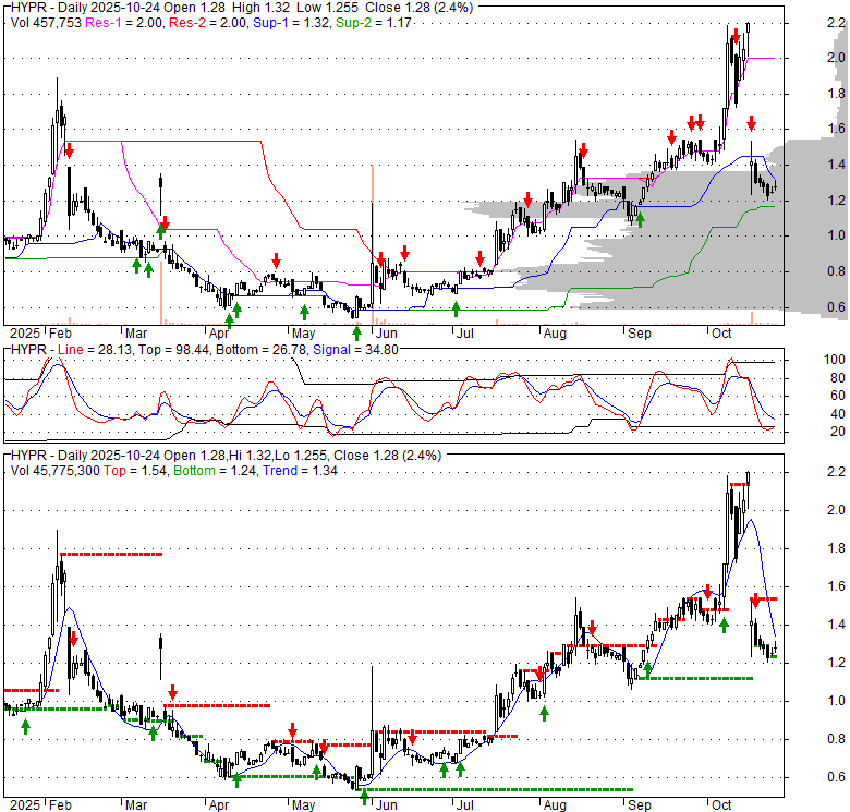 Price has closed above its short-term moving average. Short-term moving average is currently below mid-term; and above long-term moving average. From the relationship between price and moving averages: This stock is NEUTRAL in short-term; and NEUTRAL in mid-long term.[ HYPR ] has closed above bottom band by 25.3%. Bollinger Bands are 234% wider than normal. The large width of the bands suggest high volatility as compared to its normal range. The bands have been in this wide range for 12 days. This is a sign that the current trend might continue.