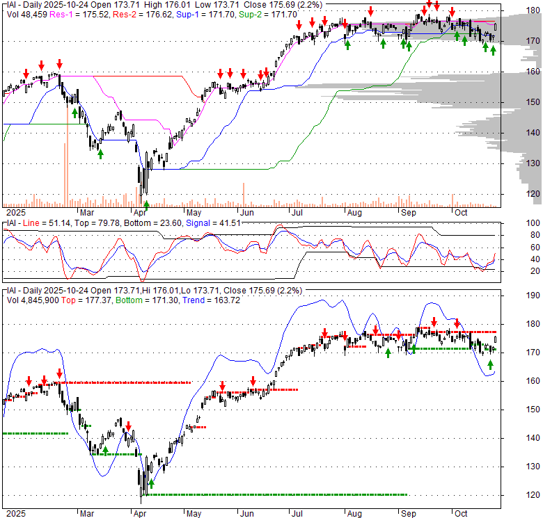 Price has closed above its short-term moving average. Short-term moving average is currently below mid-term; and above long-term moving average. From the relationship between price and moving averages: This stock is NEUTRAL in short-term; and NEUTRAL in mid-long term.[ IAI ] has closed below upper band by 18.2%. Bollinger Bands are 0.7% wider than normal. The current width of the bands does not suggest anything about the future direction or movement of prices.
