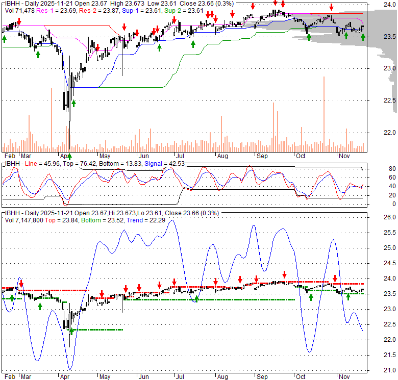 Price has closed above its short-term moving average. Short-term moving average is currently below mid-term; and below long-term moving average. From the relationship between price and moving averages: This stock is NEUTRAL in short-term; and NEUTRAL in mid-long term.[ IBHH ] has closed below upper band by 20.7%. Bollinger Bands are 33.2% narrower than normal. The current width of the bands does not suggest anything about the future direction or movement of prices.