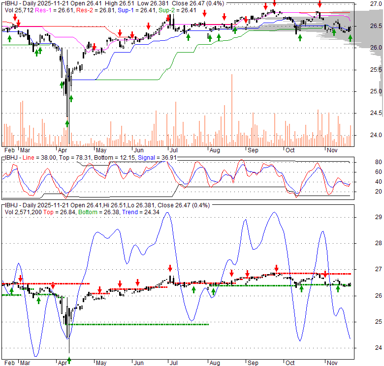 Price has closed above its short-term moving average. Short-term moving average is currently below mid-term; and below long-term moving average. From the relationship between price and moving averages: This stock is NEUTRAL in short-term; and NEUTRAL in mid-long term.[ IBHJ ] has closed below upper band by 42.5%. Bollinger Bands are 24% narrower than normal. The current width of the bands does not suggest anything about the future direction or movement of prices.