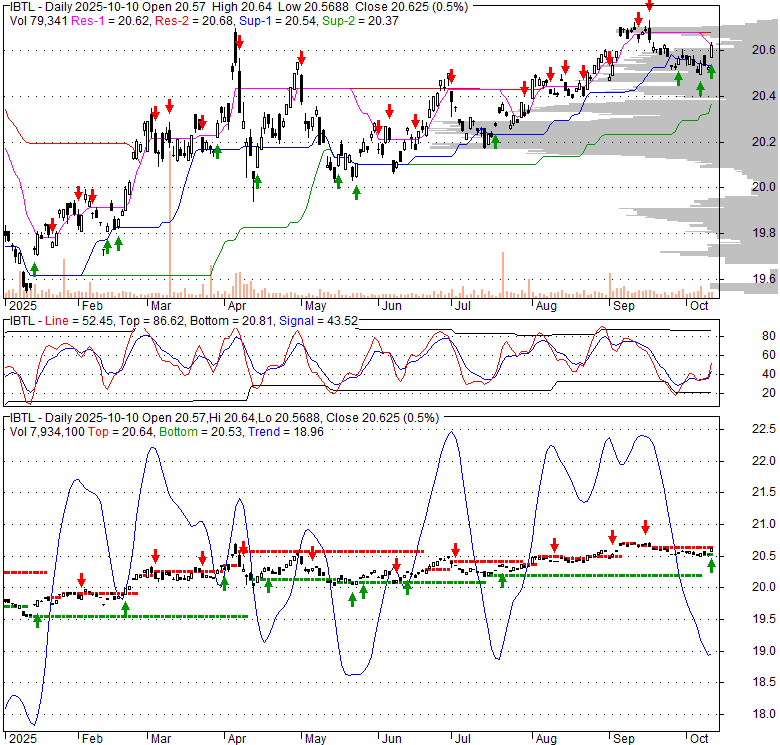 Price has closed above its short-term moving average. Short-term moving average is currently below mid-term; and above long-term moving average. From the relationship between price and moving averages: This stock is NEUTRAL in short-term; and NEUTRAL in mid-long term.[ IBTL ] has closed below upper band by 1.6%. Bollinger Bands are 50.3% narrower than normal. The narrow width of the bands suggests low volatility as compared to its normal range. The bands have been in this narrow range for 3 bars. This is a sign that the market may be about to initiate a new trend.