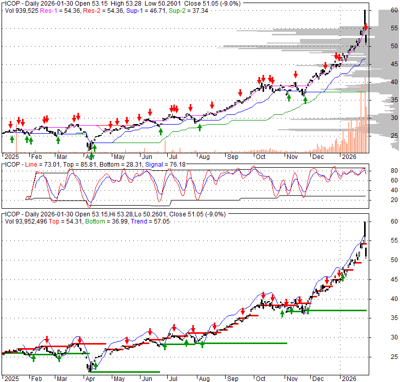Price has closed below its short-term moving average. Short-term moving average is currently above mid-term; and above long-term moving average. From the relationship between price and moving averages: This stock is NEUTRAL in short-term; and BULLISH in mid-long term.[ ICOP ] has closed above bottom band by 48.6%. Bollinger Bands are 99.6% wider than normal. The large width of the bands suggest high volatility as compared to its normal range. The bands have been in this wide range for 17 days. This is a sign that the current trend might continue.