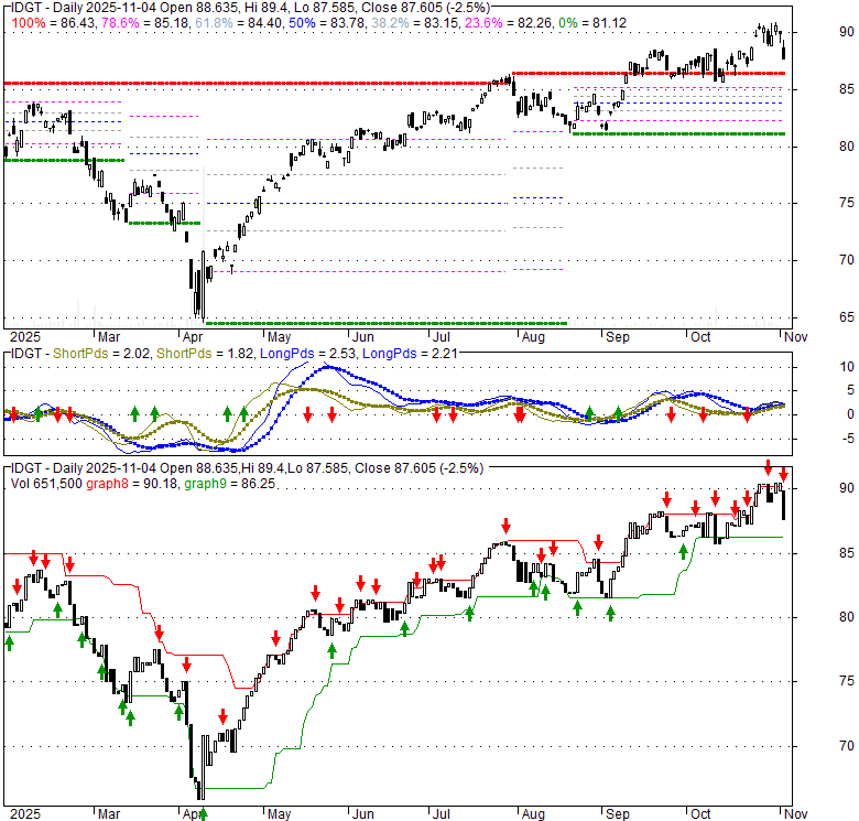Price has closed below its short-term moving average. Short-term moving average is currently above mid-term; and above long-term moving average. From the relationship between price and moving averages: This stock is NEUTRAL in short-term; and BULLISH in mid-long term.[ IDGT ] has closed above bottom band by 27.1%. Bollinger Bands are 19.9% wider than normal. The current width of the bands does not suggest anything about the future direction or movement of prices.