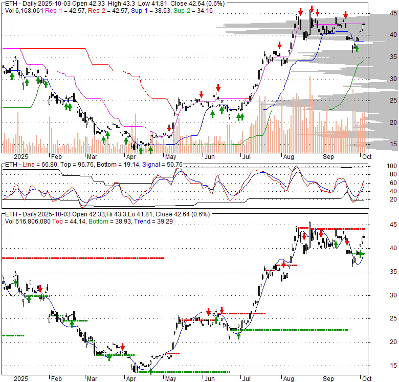 Price has closed below its short-term moving average. Short-term moving average is currently below mid-term; and below long-term moving average. From the relationship between price and moving averages: This stock is NEUTRAL in short-term; and NEUTRAL in mid-long term.[ IETH ] has closed Bollinger Bands are 0% narrower than normal.