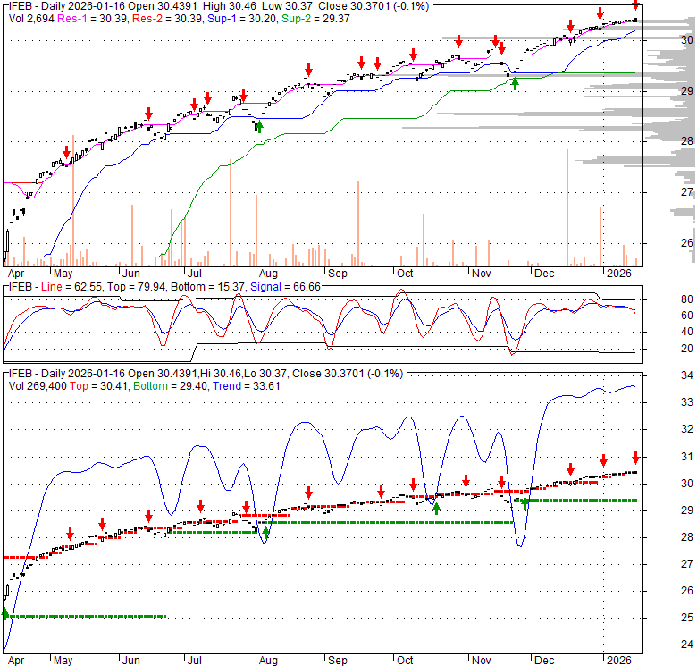 Price has closed below its short-term moving average. Short-term moving average is currently above mid-term; and above long-term moving average. From the relationship between price and moving averages: This stock is NEUTRAL in short-term; and BULLISH in mid-long term.[ IFEB ] has closed below upper band by 37.5%. Bollinger Bands are 53% narrower than normal. The narrow width of the bands suggests low volatility as compared to its normal range. The bands have been in this narrow range for 3 bars. This is a sign that the market may be about to initiate a new trend.