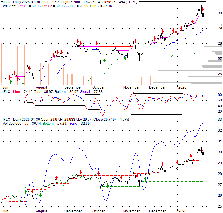 Price has closed below its short-term moving average. Short-term moving average is currently above mid-term; and above long-term moving average. From the relationship between price and moving averages: This stock is NEUTRAL in short-term; and BULLISH in mid-long term.[ IFLO ] has closed below upper band by 38.8%. Bollinger Bands are 59.1% wider than normal. The large width of the bands suggest high volatility as compared to its normal range. The bands have been in this wide range for 3 days. This is a sign that the current trend might continue.