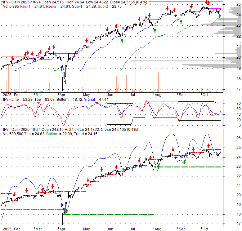 Price has closed above its short-term moving average. Short-term moving average is currently above mid-term; and above long-term moving average. From the relationship between price and moving averages: This stock is BULLISH in short-term; and BULLISH in mid-long term.[ IFV ] has closed below upper band by 32.9%. Bollinger Bands are 27.9% narrower than normal. The current width of the bands does not suggest anything about the future direction or movement of prices.