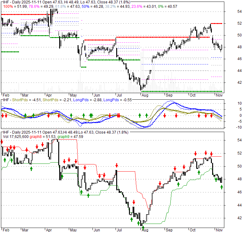 Price has closed above its short-term moving average. Short-term moving average is currently below mid-term; and above long-term moving average. From the relationship between price and moving averages: This stock is NEUTRAL in short-term; and NEUTRAL in mid-long term.[ IHF ] has closed above bottom band by 30.8%. Bollinger Bands are 42.4% wider than normal. The large width of the bands suggest high volatility as compared to its normal range. The bands have been in this wide range for 2 days. This is a sign that the current trend might continue.
