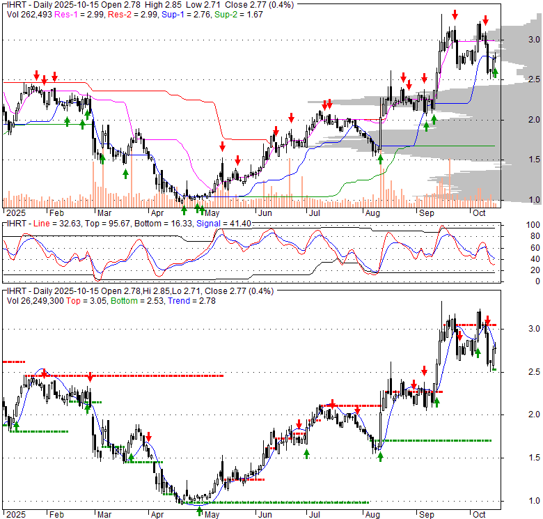 Price has closed above its short-term moving average. Short-term moving average is currently above mid-term; and above long-term moving average. From the relationship between price and moving averages: This stock is BULLISH in short-term; and BULLISH in mid-long term.[ IHRT ] has closed above bottom band by 37.9%. Bollinger Bands are 8.5% wider than normal. The current width of the bands does not suggest anything about the future direction or movement of prices.