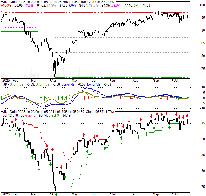 Price has closed above its short-term moving average. Short-term moving average is currently above mid-term; and above long-term moving average. From the relationship between price and moving averages: This stock is BULLISH in short-term; and BULLISH in mid-long term.[ IJK ] has closed below upper band by 4.3%. Bollinger Bands are 15.4% wider than normal. The current width of the bands does not suggest anything about the future direction or movement of prices.