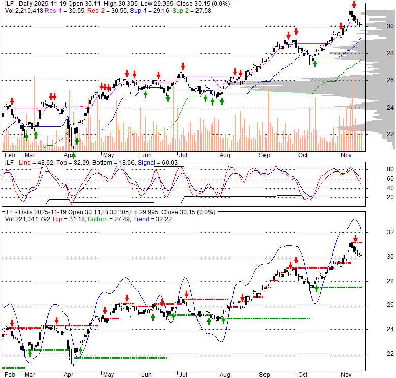 Price has closed below its short-term moving average. Short-term moving average is currently above mid-term; and above long-term moving average. From the relationship between price and moving averages: This stock is NEUTRAL in short-term; and BULLISH in mid-long term.[ ILF ] has closed below upper band by 47.2%. Bollinger Bands are 16.6% wider than normal. The current width of the bands does not suggest anything about the future direction or movement of prices.
