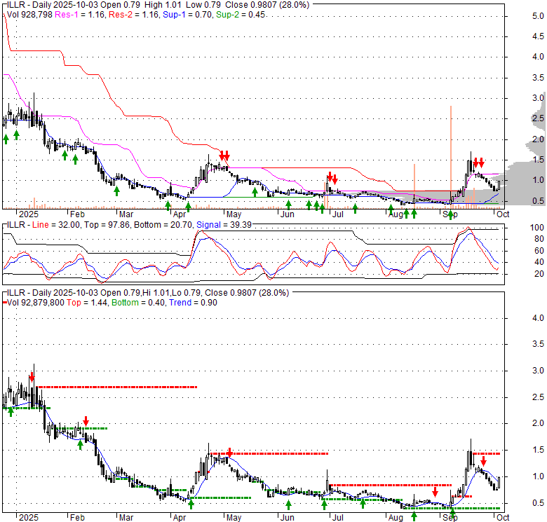 Price has closed above its short-term moving average. Short-term moving average is currently above mid-term; and above long-term moving average. From the relationship between price and moving averages: This stock is BULLISH in short-term; and NEUTRAL in mid-long term.[ ILLR ] has closed above bottom band by 42.7%. Bollinger Bands are 85.5% wider than normal. The large width of the bands suggest high volatility as compared to its normal range. The bands have been in this wide range for 13 days. This is a sign that the current trend might continue.