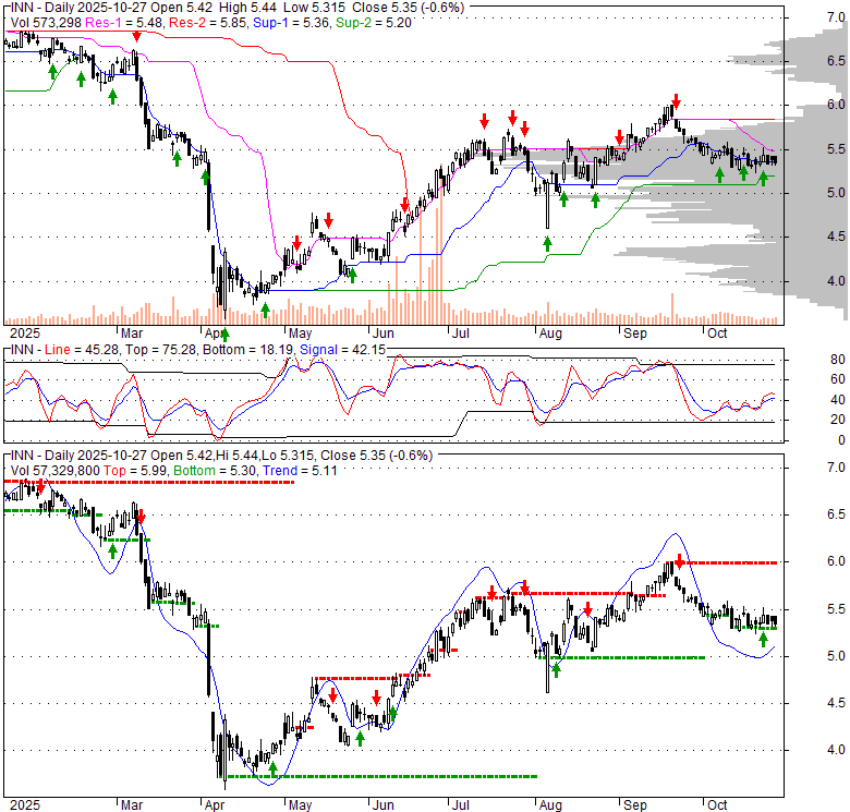 Price has closed below its short-term moving average. Short-term moving average is currently below mid-term; and above long-term moving average. From the relationship between price and moving averages: This stock is BEARISH in short-term; and NEUTRAL in mid-long term.[ INN ] has closed above bottom band by 14.0%. Bollinger Bands are 60% narrower than normal. The narrow width of the bands suggests low volatility as compared to its normal range. The bands have been in this narrow range for 10 bars. This is a sign that the market may be about to initiate a new trend.