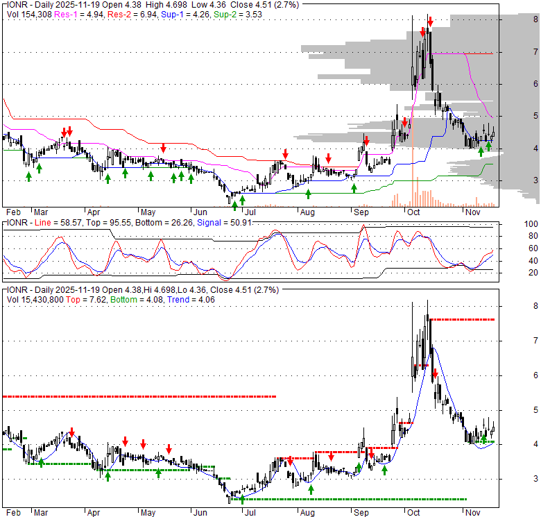 Price has closed above its short-term moving average. Short-term moving average is currently below mid-term; and above long-term moving average. From the relationship between price and moving averages: This stock is NEUTRAL in short-term; and NEUTRAL in mid-long term.[ IONR ] has closed below upper band by 36.4%. Bollinger Bands are 45% narrower than normal. The narrow width of the bands suggests low volatility as compared to its normal range. The bands have been in this narrow range for 0 bars. This is a sign that the market may be about to initiate a new trend.